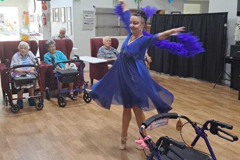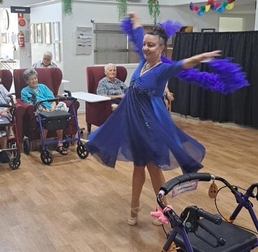 Christine’s cabaret show was an absolute delight! Residents were captivated by the vibrant costumes, lively music, and energetic dancing. Christine brought a wonderful warmth and connection, engaging with each resident and making them feel truly special. Her dedication and passion for the performance were evident, and both staff and residents haven’t stopped raving about the experience. We’re already looking forward to welcoming her back!